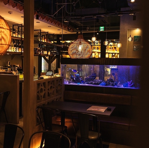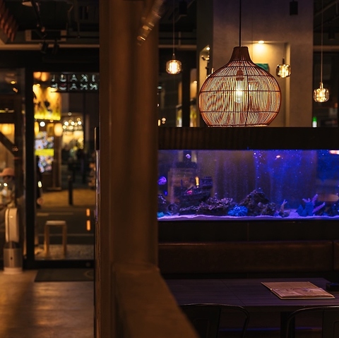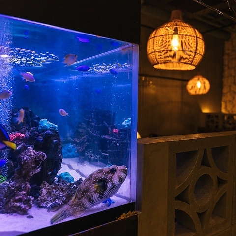 【アクアリウムダイニング】水槽きらめく店内で,旅先ならではの開放感を味わうことができます。スペースにゆとりを持たせた店内で、グループでのご利用時にも思う存分おしゃべりとお食事をお楽しみください。宴会ご希望の際は、早めのご予約がおすすめです。