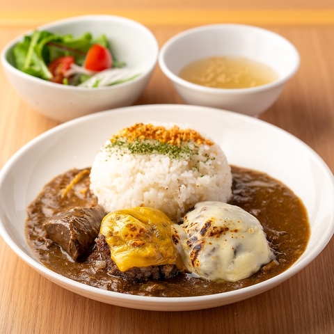サラダ・スープ付・牛肉づくしの贅沢カレー! 衝撃の口どけ!焼肉店ならではの牛すじたっぷりの特製カレー♪肉の旨味がとけこんだスパイシーなルウと、牛肉100%使用のジューシーなチーズハンバーグどの相性抜群!スペシャル&ボリューム満点の一皿です。