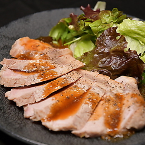 低温でじっくり火を入れ、柔らかくしっとり仕上げたポークステーキ!醤油とにんにくのソースでお召し上がりください。静岡駅/居酒屋/飲み放題/歓迎会/デート/ディナー/記念日/女子会/貸切/宴会