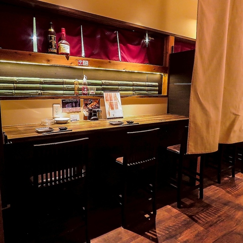 カウンター横並びタイプの個室です。カップルなど2名様に人気。横並びだから気を使わなくて大丈夫なのが心地よい。