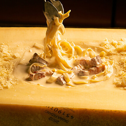 厚切りベーコンのクリームパスタをホールチーズへ入れて仕上げます。混ぜるほどに濃厚さが増していく、たっぷりのチーズと絡まった濃厚コク旨クリームパスタを体感してください。