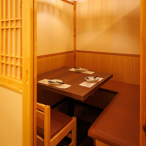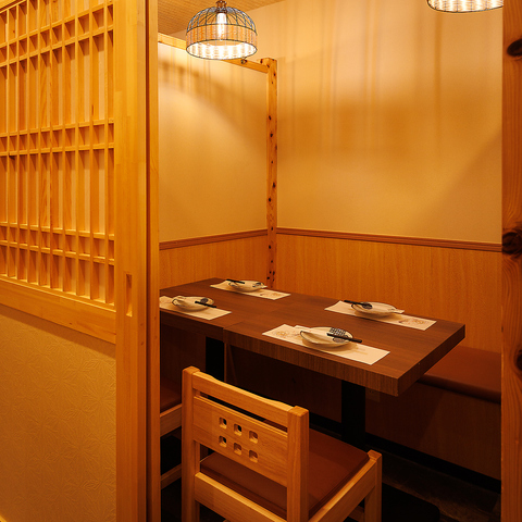 少人数様向けの個室席。ゆったり落ち着いた雰囲気の中ゆったりとご宴会をお楽しみいただけます。普段使いやデート、ちょっとした飲み会など、少人数でのご宴会に最適な個室空間となっております。