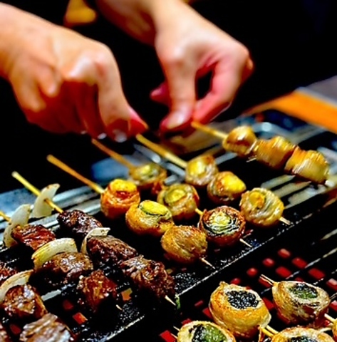 特に人気は中落カルビ串!その他、定番の豚バラ串、パリッパリの皮串、トマトチーズ串など全23種。