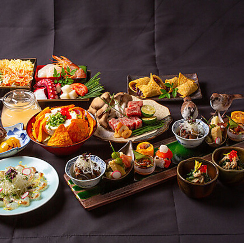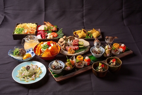 新鮮な魚介や希少部位の和牛など、素材にこだわった一品料理を豊富に取り揃えております。名物の創作もんじゃや、職人が目の前で焼き上げる鉄板焼きは、香りや音まで楽しめる五感を刺激する仕上がり♪熟練の技が光る逸品の数々を、2時間の飲み放題が付いたスペシャルなコースで贅沢に味わっていただけます。