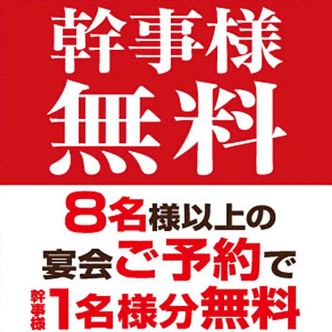 8名様以上のコース予約で⇒幹事1名様無料!お得な宴会プランがさらにお得に!幹事様の味方です!
