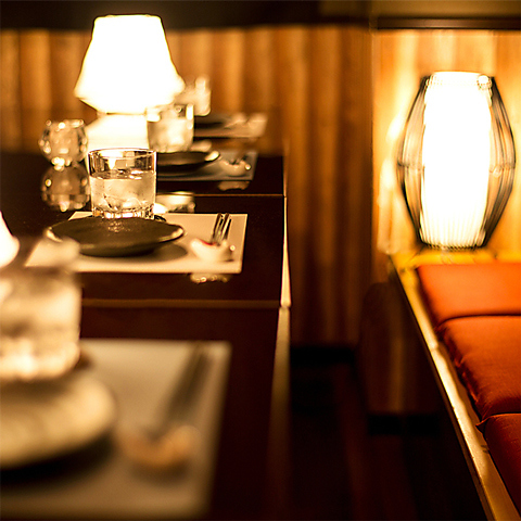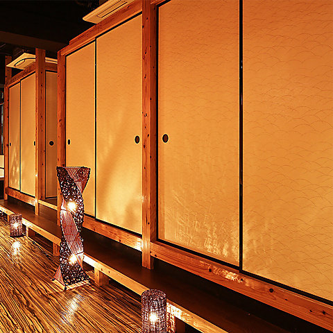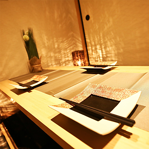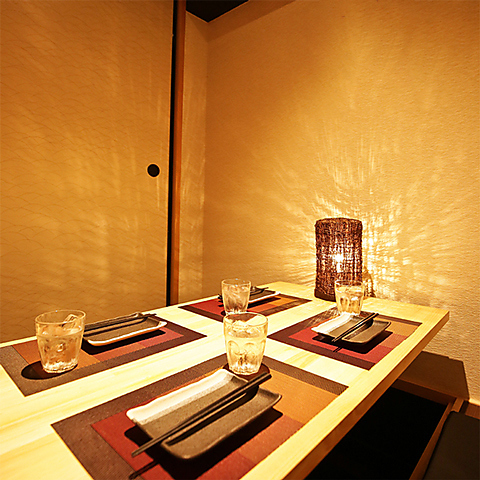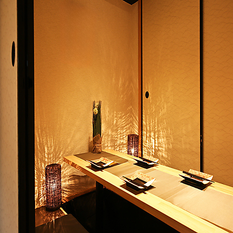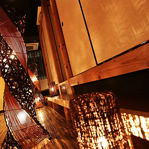 柔らかな灯りが壁に幻想的な影を映す、まるで和モダンな隠れ家個室空間!木の温もりあるテーブルや上品な和の装飾が、落ち着いた雰囲気を演出してくれます!プライベート感たっぷりなので、デートや記念日にもピッタリ♪ゆっくり会話を楽しみながら、当店自慢の創作料理を味わう贅沢な時間が過ごせる、こだわりの詰まった空間です!