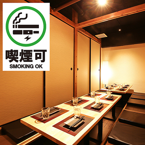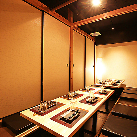 柔らかな灯りが壁に美しく広がる、落ち着いた雰囲気が自慢の個室空間!品のある木目のテーブルにこだわりが感じられ、料理がより引き立ちます!掘りごたつタイプの個室席で足を伸ばしてくつろぎながら、ゆっくりとお酒や創作料理を楽しめます!飲み会や宴会はもちろん、女子会・合コンにもピッタリな癒しの空間です!