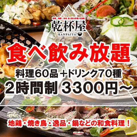 ゆったり3H制の食べ飲み放題コースも4000円~ご用意してます!逸品・サラダ・おつまみ・揚げ物・鍋・デザートなどのお料理全60品食べ放題に、カクテル・サワー・ハイボール・梅酒・日本酒・ワインの種類豊富なドリンクメニューが飲み放題!乾杯屋千葉本店の食べ飲み放題で宴会・飲み会をお楽しみください!団体様も大歓迎です!
