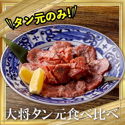 肉のよいち名物!注文数No.1を誇る「大将タン元食べ比べ」は1098円(税込)でご提供しております。 タンの中でも特に柔らかく脂の乗った「タン元」を贅沢に食べ比べできる一皿です。 ニンニクの効いた味付けで、自慢の釜炊きご飯との相性も抜群ですよ。