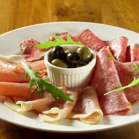 生ハム、越後牛ローストビーフ、ヤークヴルストをバランスよく盛り合わせた一皿。肉の旨みのレイヤーと塩味の心地よい余韻をお楽しみください。