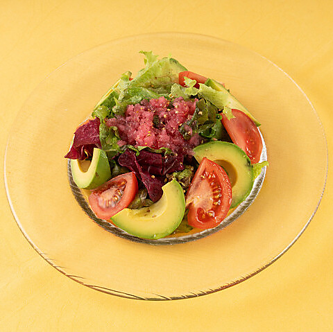 アボカドとトマトの上にレッド・オニオン・ドレッシングをかけた クラシックなキューバ風サラダ。