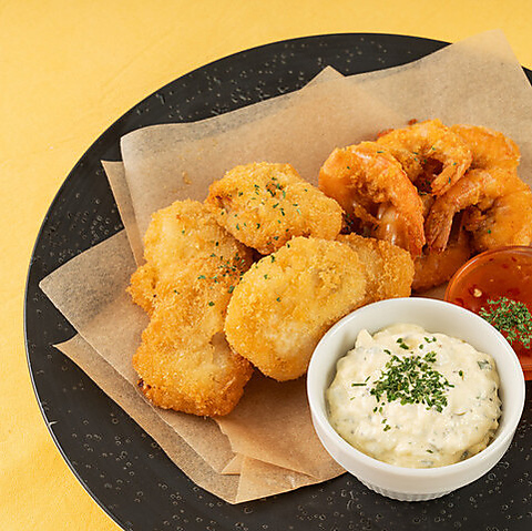 にんにくの効いたガーリックシュリンプとジューシーなのフィッシュフライ
