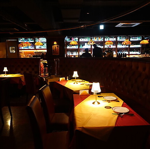 当店は、店内のどの席からもライブ演奏が楽しめるよう、ステージを囲むようにテーブル席をゆったりと配置しています。背もたれの高い広々としたソファーは、お二人様でも隣り合わせでくつろげる贅沢な造りです♪バーカウンターでは、特注シャンデリアが輝く異国情緒あふれる空間で、世界中のお酒やオリジナルカクテルをお楽しみいただけます。