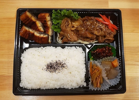 うなぎと甘辛牛カルビが楽しめる豪華なお弁当です。