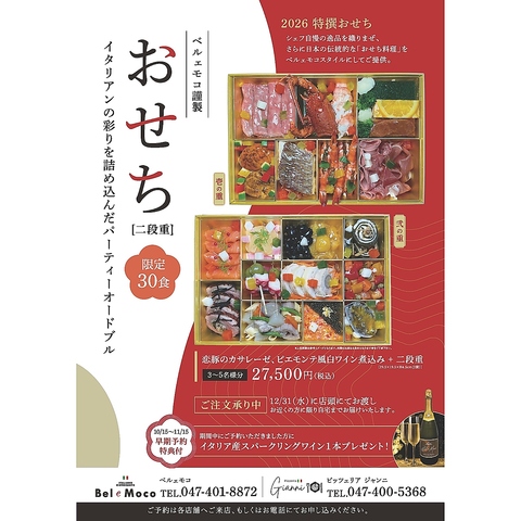 限定30食!恋豚のカサレーゼ、ピエモンテ風白ワイン煮込み+2段重早期予約特典として、10/15~11/15の期間にご予約いただいた方にイタリア産スパークリングワイン1本プレゼント!12/31店頭にてお渡しいたします。(近くの方に限り自宅までお届けいたします。)