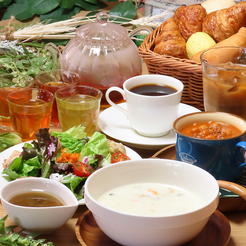 当店自慢のフランス産発酵バター使用のサクサククロワッサンと6種から選べる具だくさんスープの相性は抜群!オーガニック豆や季節のスープも楽しめ、特製サラダとドリンクバー付き。常時8~15種類のパンを取り揃え、ホテルベーカリーでの購入やアラジントースターでの再加熱も可能です!