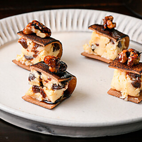 自家製レーズンバターに、くるみのキャラメリゼを乗せて生八つ橋の皮で包んだ「包み」が人気です。うま味調味料不使用。その日のスペシャリテをぜひお召し上がりください。