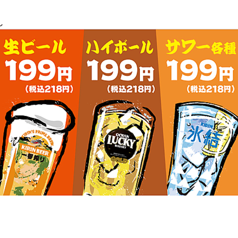 いつでも生ビール199円!!ハイボール、サワー各種もいつでも199円!!