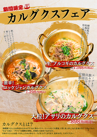 韓国でも定番のアサリカルグクスや、肌寒い日に食べたい激辛なユッケジャンカルグクスをぜひ一度ご賞味ください。もち麦ご飯と白菜キムチが付いたランチのセットもご用意しております!