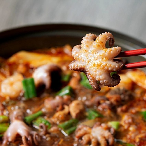 韓国・釜山の郷土料理でナッチ(タコ)、コプチャン、セウ(海老)を組み合わせた辛旨鍋です!