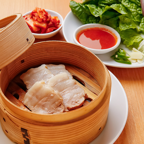 日南もち豚のポッサムを主役にした、大満足なランチコースをご用意。宮崎県産ブランド豚「日南もち豚」を、香味野菜とともにじっくり丁寧に煮込み、口の中でほどけるようなとろとろの食感に仕上げています。サンチュやエゴマの葉に包み、自家製チョジャンやキムチを添えて、自分好みの味わいでお楽しみください。