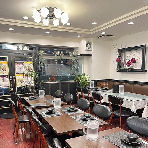 奥には片側がソファータイプになっているテーブル席をご用意。赤と黒を基調とした綺麗な内装。高級な雰囲気で本場の中華をお召し上がりください♪