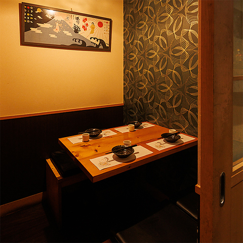 [2~4名様]名画「神奈川沖浪裏」をはじめとした粋な和柄の暖簾で仕切られ、趣きある特別感を演出した半個室。間接照明が穏やかに照らす空間には静けさが漂い、心安らぐひとときをお届けします。