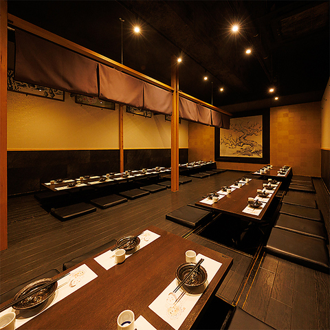 [100名様]和の装飾が壁面を彩る店内は、まるで時代絵巻の中に迷い込んだような趣。繊細な和柄の暖簾が視覚に心地よい余韻を残し、温かな灯りがテーブルを優しく包み込みます。宴席にも最適です。