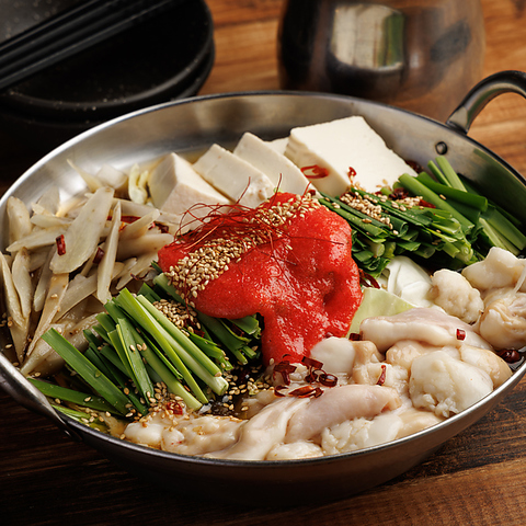 国産牛もつに、博多明太子をたっぷりのせた人気の「博多明太もつ鍋」。スープに明太子の旨みと辛みが溶け込み、やみつきになる味わいです。〆はちゃんぽん麺で最後の一滴まで楽しめる、博多名物です。