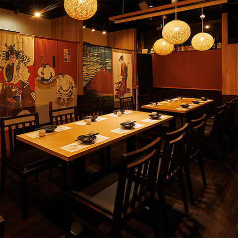 | 貸切 | 100名様×1 | [100名様]和の装飾が壁面を彩る店内は、まるで時代絵巻の中に迷い込んだような趣。繊細な和柄の暖簾が視覚に心地よい余韻を残し、温かな灯りがテーブルを優しく包み込みます。宴席にも最適です。 |