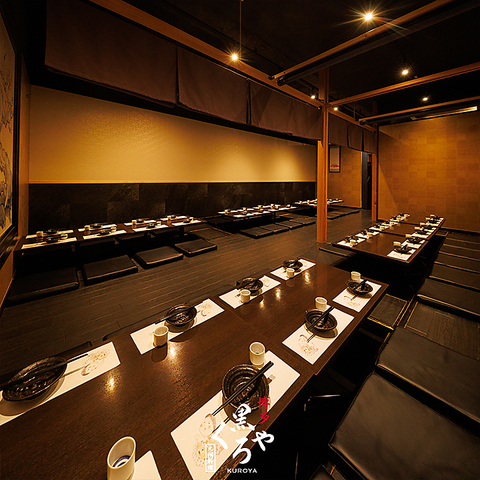 [100名様]和の装飾が壁面を彩る店内は、まるで時代絵巻の中に迷い込んだような趣。繊細な和柄の暖簾が視覚に心地よい余韻を残し、温かな灯りがテーブルを優しく包み込みます。宴席にも最適です。