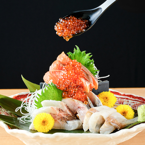 イクラを贅沢に溢した海鮮5種盛り!!料理長自ら厳選した海鮮、信州名物である信州サーモンも入っております。正直この一台で満足できるボリュームになっております。海のない長野県でも美味しい海鮮をお出ししております。是非信州の日本酒と共にご賞味ください。