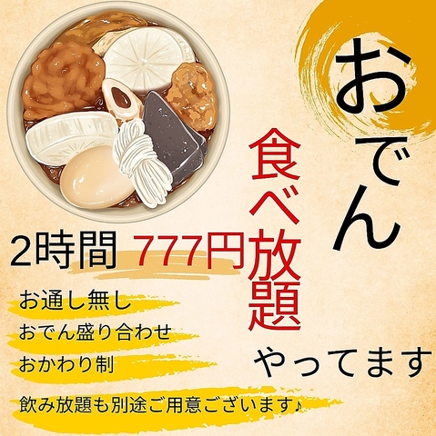 寒くなってきましたが、身体が温まるようにおでんのご用意もございます!単品だと、王道の大根、たまご、ちくわを始め、12種類!食べ放題も行いますが、盛り合わせでのご提供となります。是非、お召し上がり下さい♪