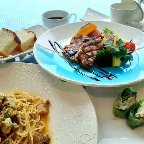 本日の前菜盛り合わせ/スープ/サルシッチャとポルチーニのパスタ/スパイシーチキンと霜降りポークのみそ焼きグリル 季節野菜を添えて/サラダ/パン/食後のドリンク +400円でシェフ特製デザート付き