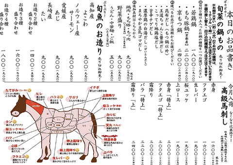 旬のお造り、口の中でトロける高級馬刺や、また全馬刺し卓上で堪能できる馬肉の焼肉など是非ご賞味ください♪♪(※週ごとに変更があるため、画像をタップしてご確認ください♪)
