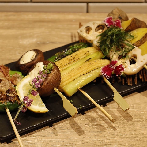【こだわり炭焼き野菜串】 厳選した旬の野菜を、職人が一本一本丁寧に炭火で焼き上げました。遠赤外線効果で、野菜本来の旨みと甘みを最大限に引き出し、香ばしい風味が食欲をそそります。ヘルシー志向の方にも大人気です。当店の看板メニューをぜひご賞味ください。