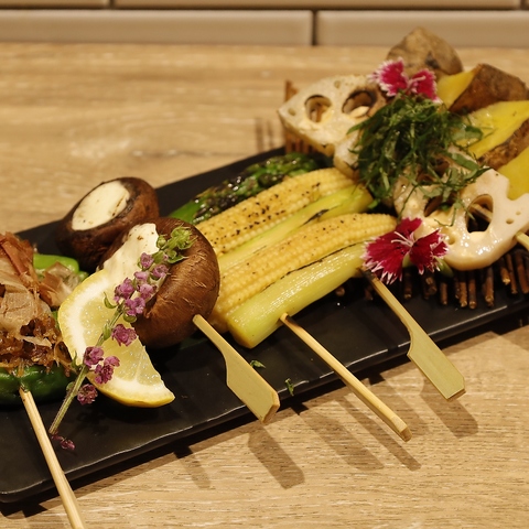 シェアできるおすすめ料理です!備長炭で焼き上げるからこそ引き立つ、旬野菜の凝縮された旨みと甘み! 外は香ばしく、中は瑞々しい食感。野菜本来の美味しさを再発見できる、当店一番のおすすめです。