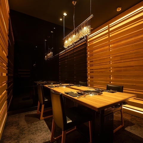 高級感溢れる完全個室席。上質な素材を使用したシックで落ち着きのある内装は、まさに大人のための特別な空間。照明の演出や豪華なテーブルセッティングが、上品な雰囲気を一層引き立てます。特別な日や接待、会食などに是非ご利用ください。