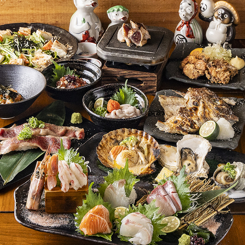 焼き牡蠣やサザエのつぼ焼き、ホタテバターなど、自慢の海鮮を贅沢に味わえる全9品の充実コース。さらに本マグロなめろうや焼き魚、唐揚げも付いて、お腹も心も大満足のボリュームです。飲み放題付きは6500円(税込)です。ご友人同士の集まりに、多彩な海鮮を心ゆくまで満喫してください。