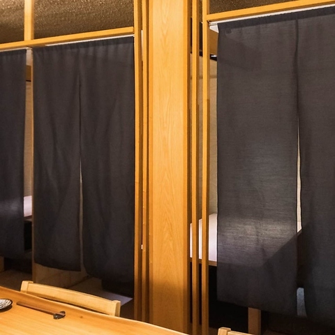 【テーブル半個室/1~4名様×2部屋】少人数のご利用に。程よいおこもり感が嬉しい空間。少人数のご利用におすすめの半個室です。通路や他のお席との間を大きな暖簾で仕切ることで、圧迫感がなく心地よい独立空間を作っています。デートやご家族、友人などお集まりの皆様だけで、会話と食事をごゆっくりお楽しみください。