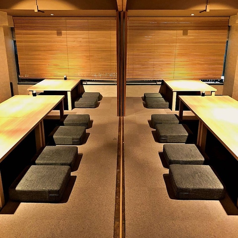 【上質を知る大人のためのくつろぎ空間】洗練された和の雰囲気と、ホッと安らぐ温もりが感じられる空間。店内奥には、接待や宴会に最適な掘りごたつ個室を完備しております。2部屋ある5~11名様までの完全個室を繋げれば、最大27名様の大宴会も可能。