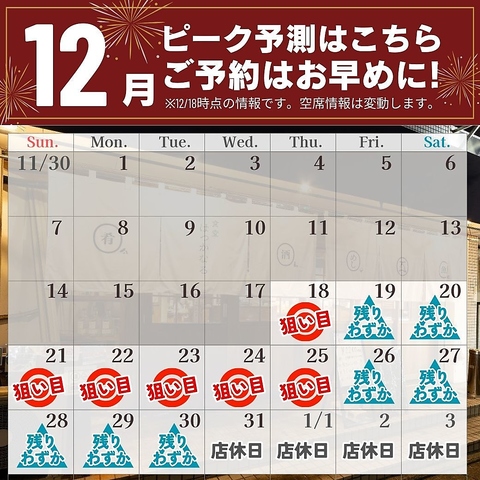 年末が近づくにつれ、週末と仕事納め後は混み合うことが予想されます。狙い目は週中の平日!