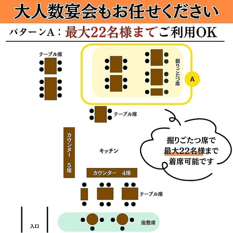 | 掘りごたつ | 22名様×1 | 店舗右奥の掘りごたつ席を全て利用すると、最大22名様までご着席いただけます。足を伸ばしてゆったり過ごす宴会はいかがですか? |