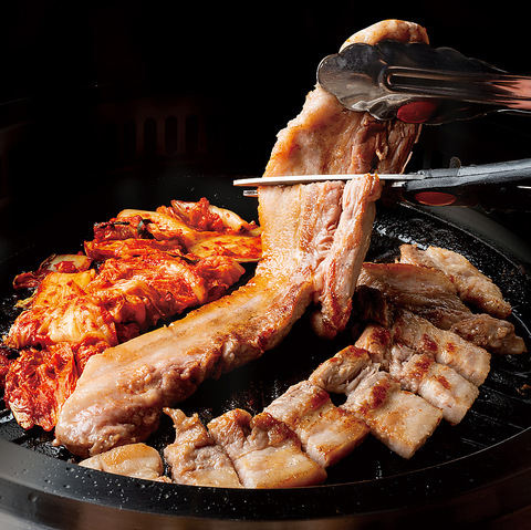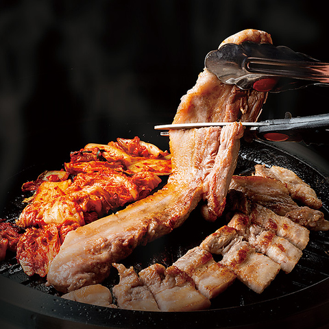 一度も冷凍していないチルドポークを使った「サムギョプサル」が人気に逸品!サンチュやえごまの葉、豆もやしナムル、ニンニク、青唐辛子がセットに!さらに、味付きサムギョプサルとのハーフ&ハーフのオーダーも可能。こんがり焼いたお肉をサンチュに乗せ、お好みの薬味や焼きキムチと一緒に楽しんでください!