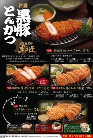 飼育期間200日以上とじっくり丹念に育て上げ、豊かな旨味ときめ細かい肉質が特徴のブランド黒豚。定番ロースかつや棒ヒレかつ、じっくりとその味わいを堪能できる「厚切りリブロースかつ」もお薦めです。黒の匠ならではの旨みとコクをお楽しみください。