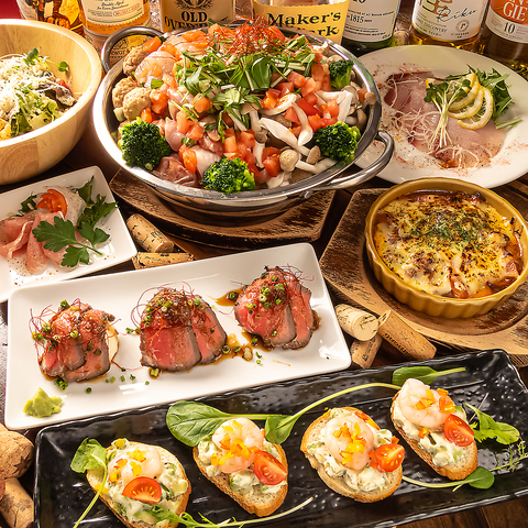 2時間飲み放題付きで6000円(税込)というお手頃価格での宴会プラン♪エビとクリームチーズのブルスケッタやポークスペアリブといった自慢の創作料理全9品がリーズナブルにお楽しみ頂けます。大事な接待や、お仲間との二次会、ご家族でのお食事会など各種ご宴会にオススメです♪お手頃価格にて少人数様から団体様までお楽しみ頂けます♪