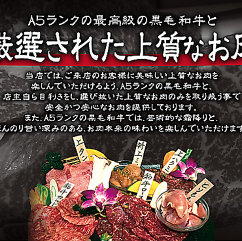 当店では、ご来店のお客様に美味しい上質なお肉を楽しんでいただけるよう、A5ランクの黒毛和牛と、店主自ら目利きをし、選びぬいた上質なお肉のみを取り扱う事で安全かつ安心なお肉を提供しております。また、A5ランクの黒毛和牛では、芸術的な霜降りと、ほんの甘い深みのある、お肉本来の味わいを楽しんでいただけます。