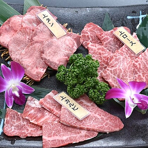 食堂楽で人気の上部位3種類(上タン・和牛カルビ・和牛上ロース)を盛り合わせにしました。