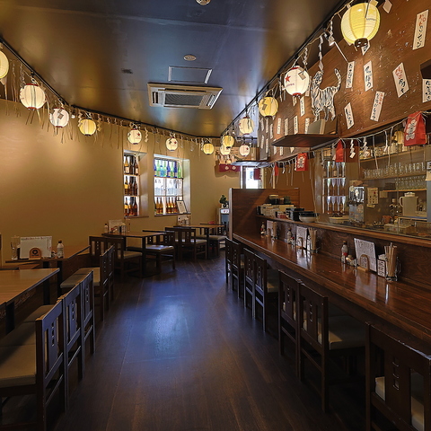 頭上には提灯が灯り、暖かな光で包まれる空間が広がります。窓際には日本酒の空き瓶が並べられていて、日差しに照らされるとガラス越しにキラキラと美しく輝きます。広々とした店内は落ち着いた茶色を基調としており、どこか懐かしく、居心地のいい雰囲気。仲間との食事も、一人の時間も、心地よく過ごせる空間です。