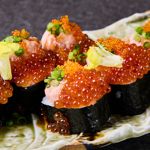 俺のやきとり名物「俺の巻き寿司」はOPENから長く人気No.1の座をキープする逸品!!太巻きにネギトロとこぼれるほどのいくらを乗せたフォトジェニックなだけでなく食べ応えも抜群の一品です♪一口で食べるのは困難なほどのボリュームをぜひご賞味ください!!【蒲田 俺の 焼き鳥 炭火 コスパ 宴会 女子会 歓送迎会 飲み会 飲み放題 貸し切り】